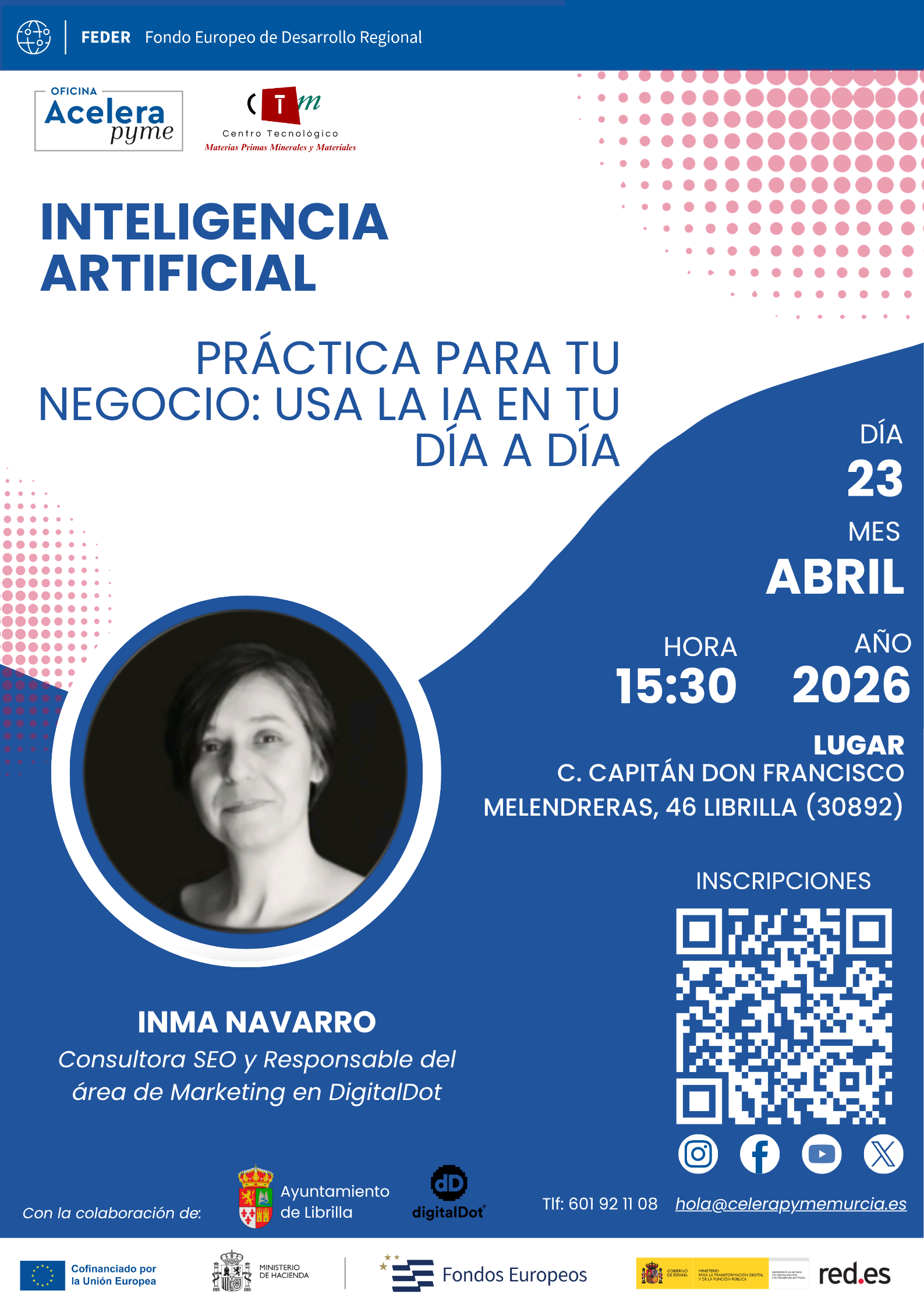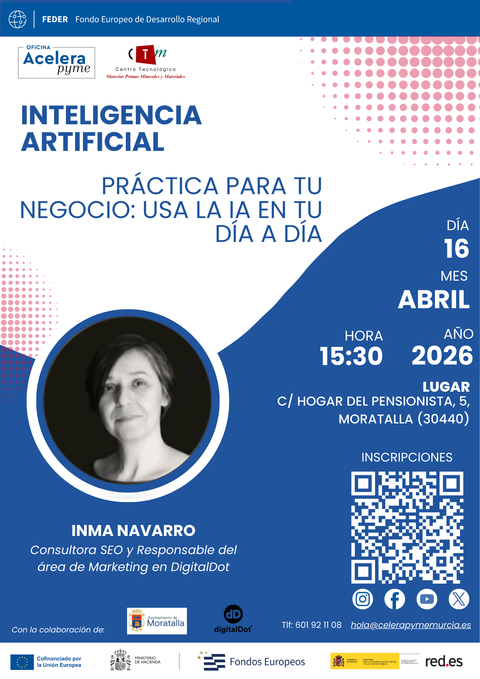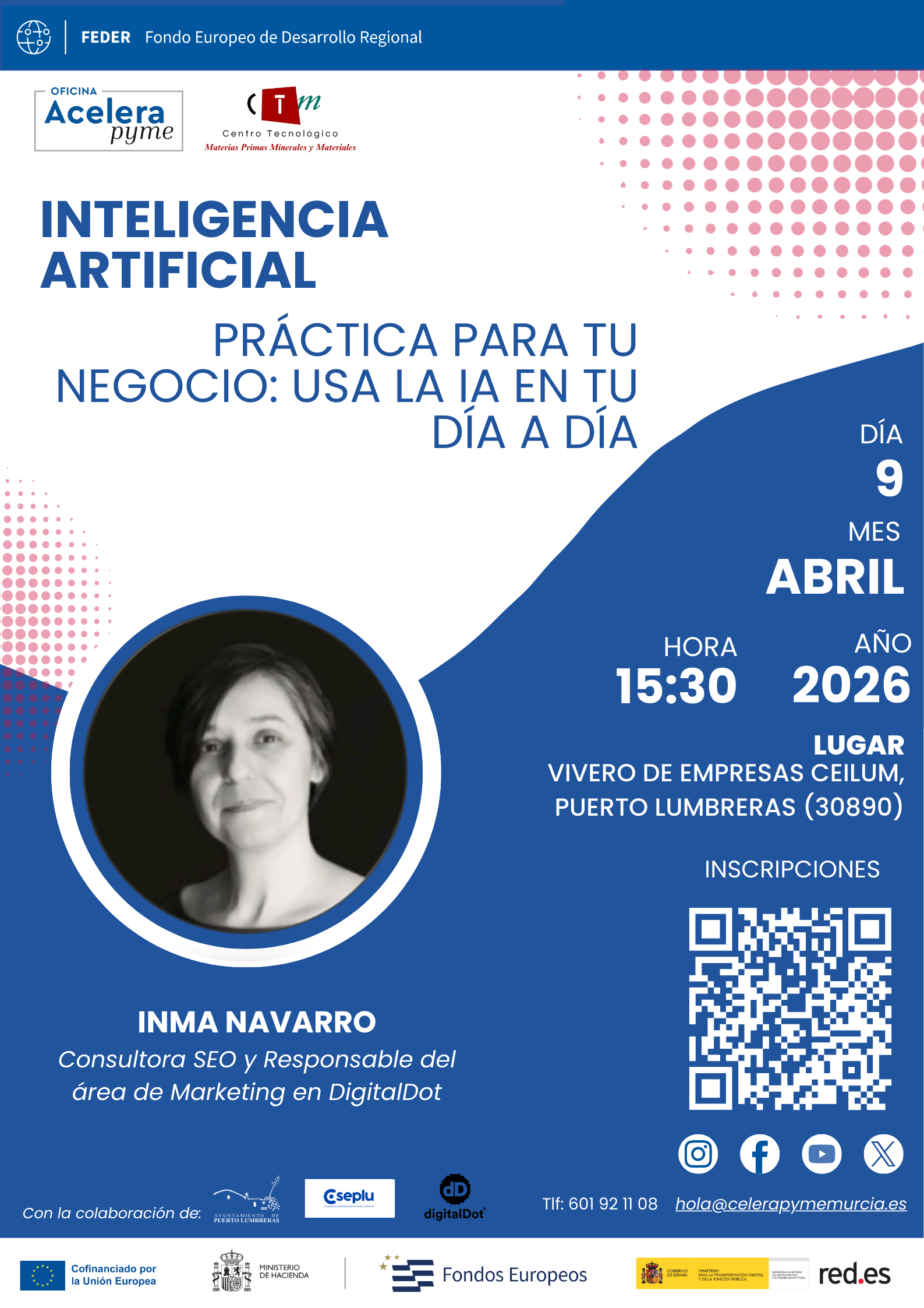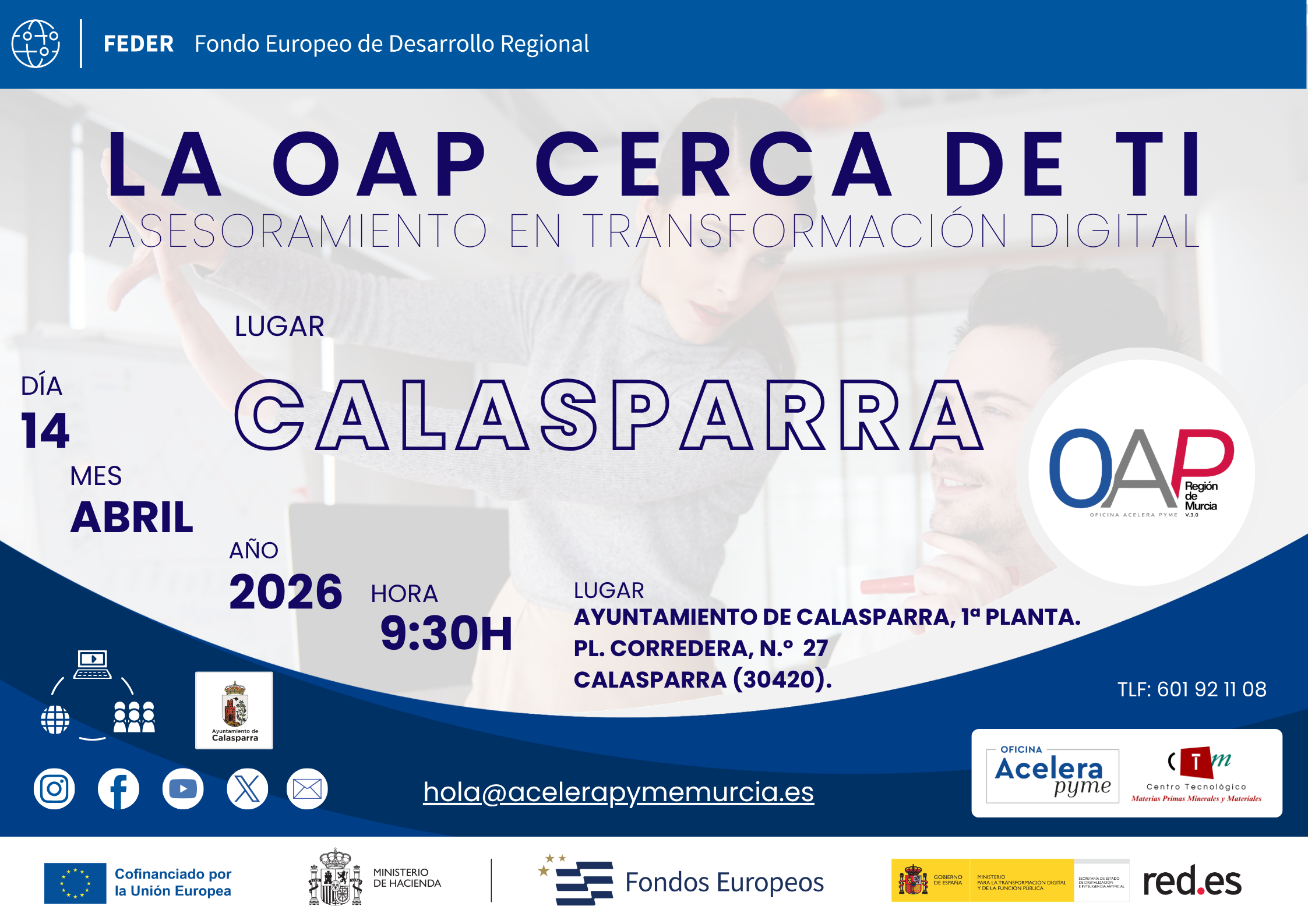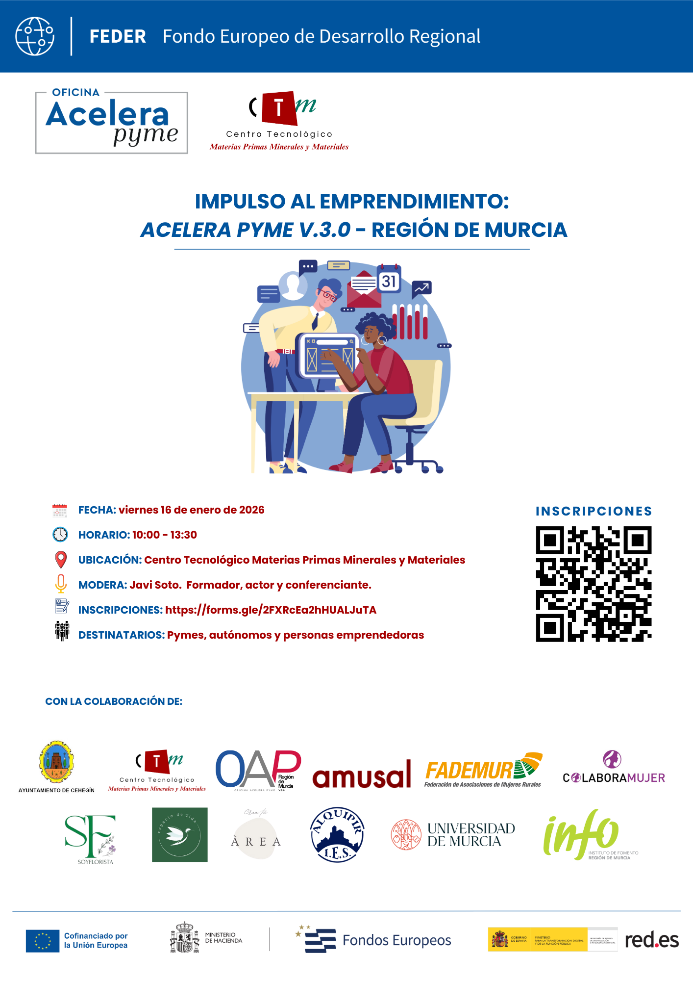 La nueva Oficina Acelera Pyme v3.0 – Región de Murcia ya se encuentra en marcha. Si necesitas asesoramiento o soporte en transformación digital, emprendimiento tecnológico o incorporación de soluciones TIC, puedes contactar con nuestro equipo a través de esta web. Ofrecemos atención gratuita, tanto presencial como virtual, dirigida a pymes, autónomos y personas emprendedoras de toda la Región de Murcia.