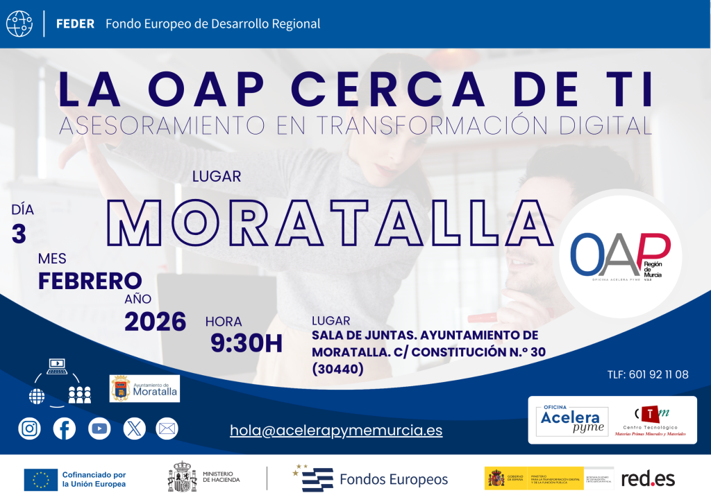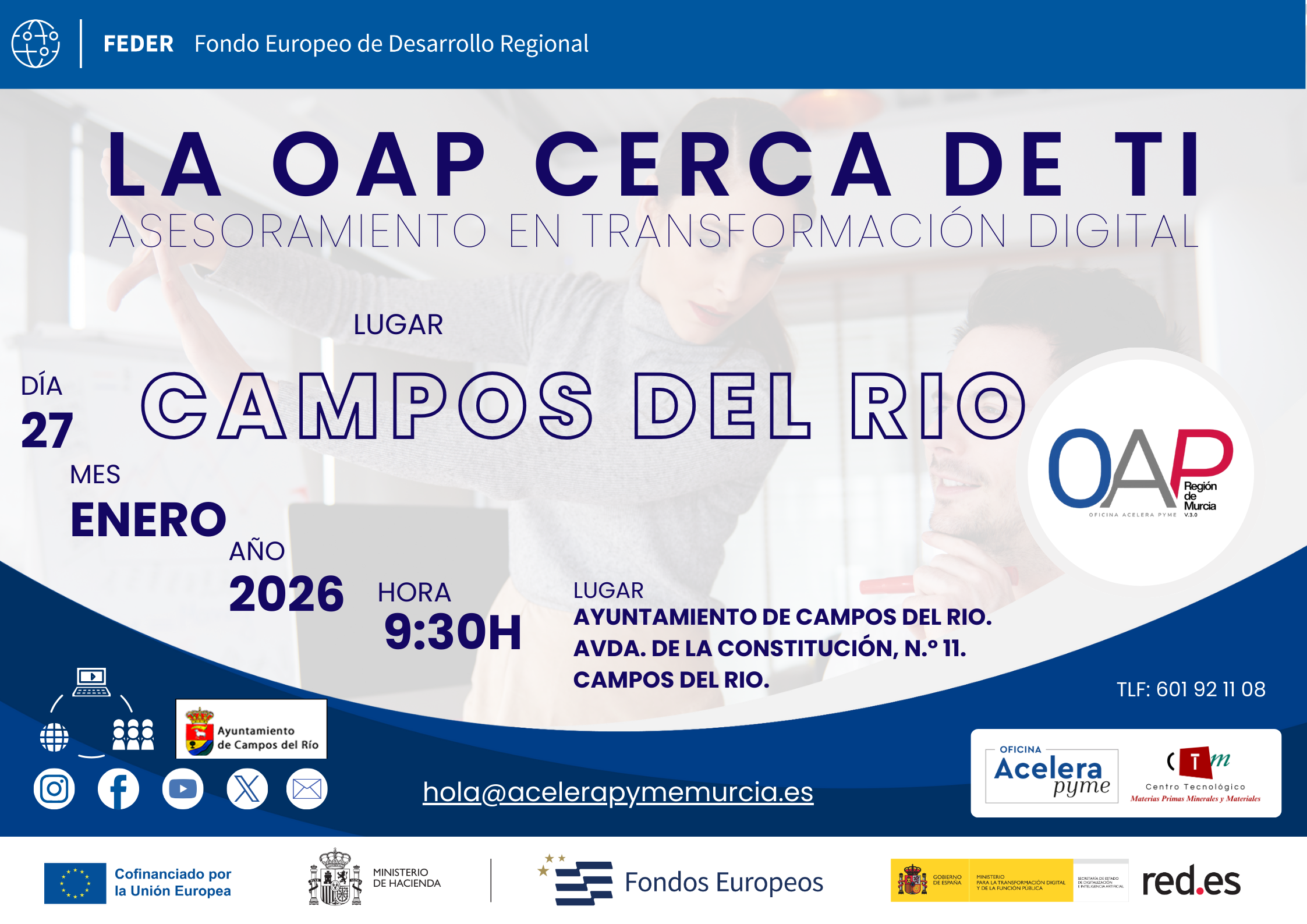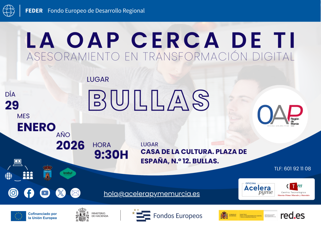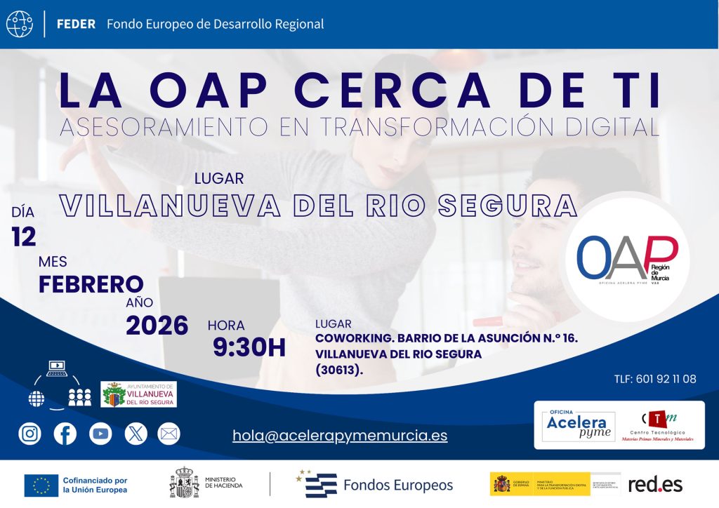 Próximos eventos OAP CERCA DE TI CAMPOS DEL RÍO27/01/2026 Inscribete aquí: 601 92 11 08[email protected] VERI*FACTU Y FACTURA ELECTRÓNICA28/01/2026 inscríbete con este enlaceo llámanos 601 92 11 08[email protected] OAP CERCA DE TI BULLAS29/01/2026 Inscribete aquí: 601 92 11 08[email protected] OAP CERCA DE TI ALBUDEITE30/01/2026 Inscribete aquí: 601 92 11 08[email protected] OAP CERCA DE TI MORATALLA03/02/2026 Inscribete aquí: 601 92 11 08[email protected] VERI*FACTU Y FACTURA ELECTRÓNICA05/02/2026 Inscribete aquí: 601 92 11 08[email protected] OAP CERCA DE TI CAMPOS DEL RIO10/02/2026 Inscribete aquí: 601 92 11 08[email protected] INTELIGENCIA ARTIFICIAL PRACTICA PARA TU NEGOCIO: USA LA IA EN TU DÍA A DÍA11/02/2026 Inscribete aquí: 601 92 11 08[email protected] OAP CERCA DE TI VILLANUEVA DEL RIO SEGURA: 12/02/2026 Inscribete aquí: 601 92 11 08[email protected] OAP CERCA DE TI BLANCA17/02/2026 Inscribete aquí: 601 92 11 08[email protected] EVENTOS REALIZADOS