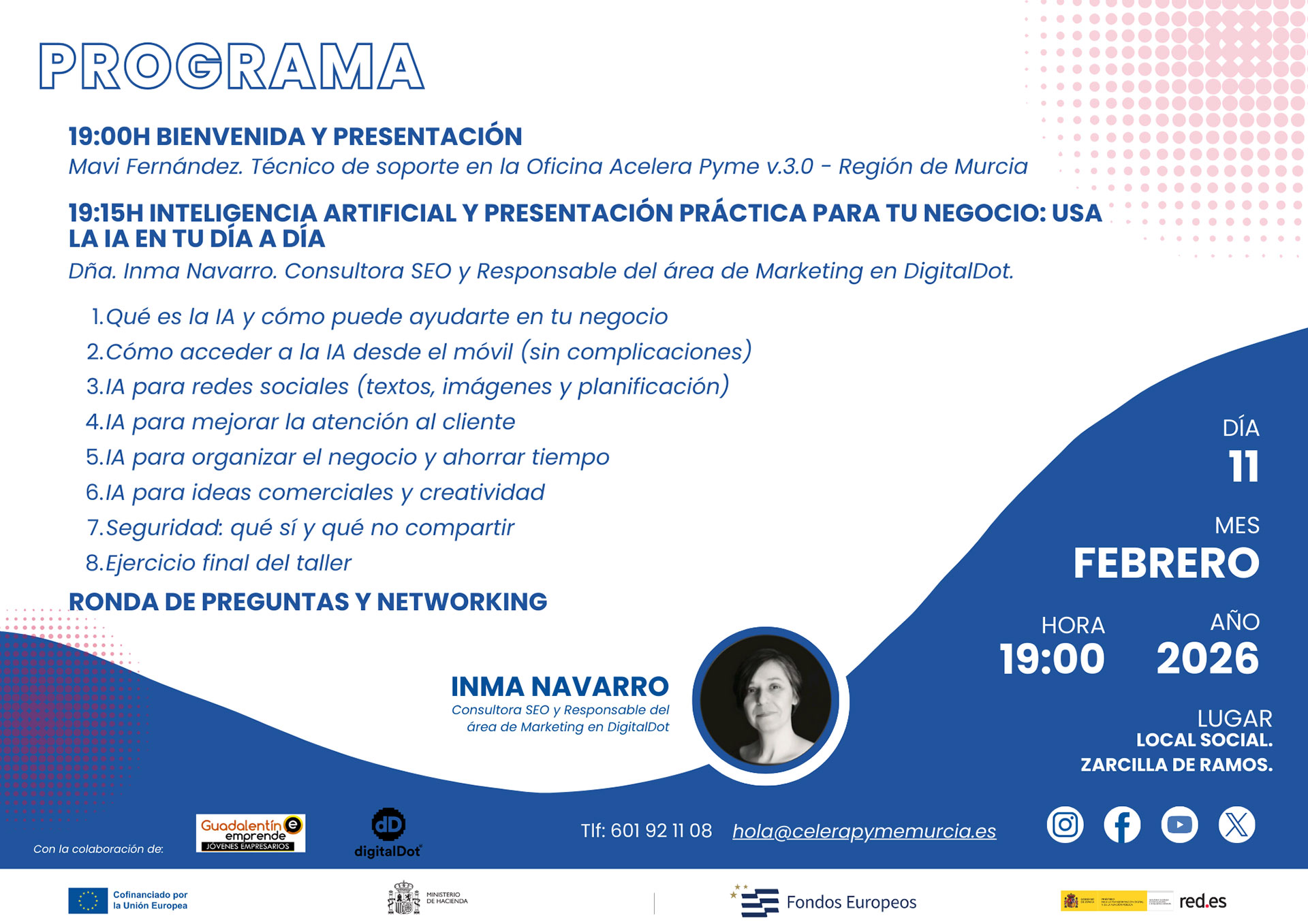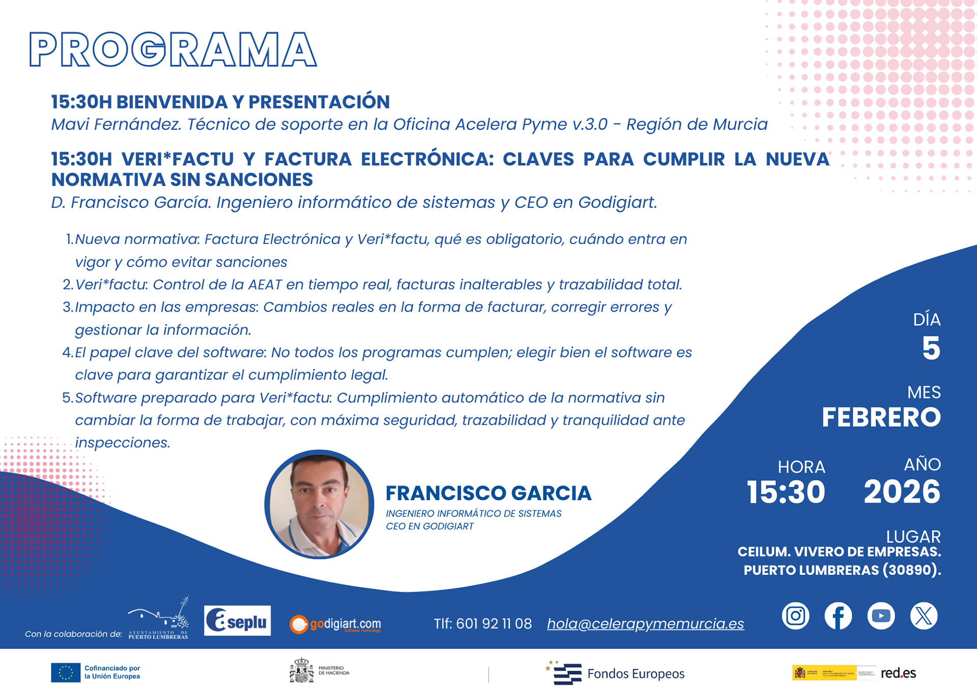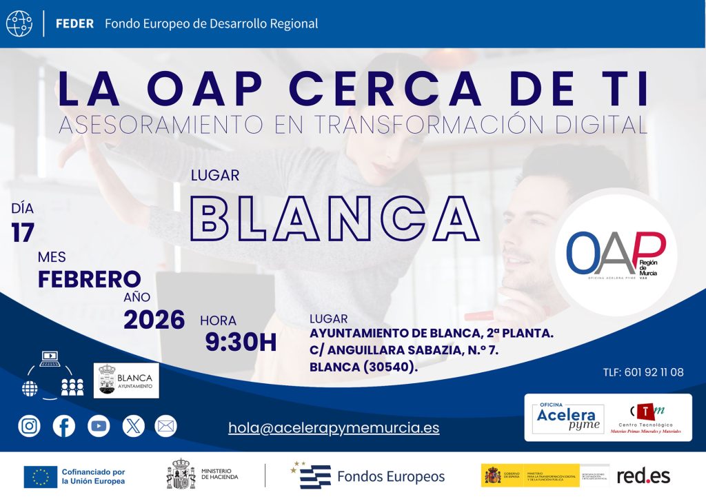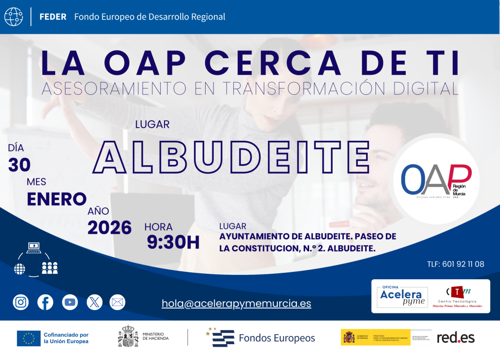 Próximos eventos OAP CERCA DE TI CAMPOS DEL RÍO27/01/2026 Inscribete aquí: 601 92 11 08[email protected] VERI*FACTU Y FACTURA ELECTRÓNICA28/01/2026 inscríbete con este enlaceo llámanos 601 92 11 08[email protected] OAP CERCA DE TI BULLAS29/01/2026 Inscribete aquí: 601 92 11 08[email protected] OAP CERCA DE TI ALBUDEITE30/01/2026 Inscribete aquí: 601 92 11 08[email protected] OAP CERCA DE TI MORATALLA03/02/2026 Inscribete aquí: 601 92 11 08[email protected] VERI*FACTU Y FACTURA ELECTRÓNICA05/02/2026 Inscribete aquí: 601 92 11 08[email protected] OAP CERCA DE TI CAMPOS DEL RIO10/02/2026 Inscribete aquí: 601 92 11 08[email protected] INTELIGENCIA ARTIFICIAL PRACTICA PARA TU NEGOCIO: USA LA IA EN TU DÍA A DÍA11/02/2026 Inscribete aquí: 601 92 11 08[email protected] OAP CERCA DE TI VILLANUEVA DEL RIO SEGURA: 12/02/2026 Inscribete aquí: 601 92 11 08[email protected] OAP CERCA DE TI BLANCA17/02/2026 Inscribete aquí: 601 92 11 08[email protected] EVENTOS REALIZADOS
